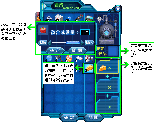 在合成功能的选项里,会有三个空格,让玩家放入要熔入炉中的物品。它不但代表着每一次将要合成出炉的装备或道具,也还影响到合成后的等级高低喔!至于怎样才能合成高级的道具及武器,「材质」可是重点喔!