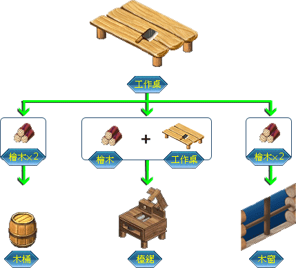 当做出工作桌后,就能利用刚得到的桧木,制作木窗、木桶,也能将工具桌升级成台锯,这些都是制作初期的必要工具;当升级成台锯时,即可制作各式各样的家具和工具。