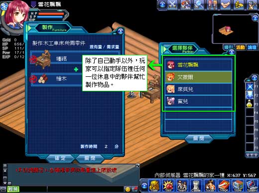 玩家们一定发现到,大多数的家具物品都需要不少制作时间,除了干等,难道没有其他办法吗?此时,就需要伙伴们的帮忙啦!当选择制作时间超过一分钟的物品,系统就会自动弹出伙伴窗口,玩家只要指定一位伙伴在小屋里制作,就能放心到外头练功啦!等时间一到,成品便自动出炉了!