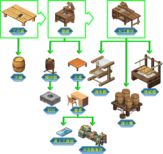 最根本也是最重要的制作工具,玩家在制作初期时一定要将此类工具提升到最高,才有助于后续制作的发展。主要功能在于可以生产其他制作工具,以及大量的木制家具。以木头、桧木为主要素材。