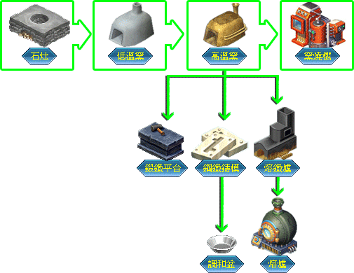 最初由木桌制造,除了能烹煮食材外,木碳、地砖等需要用高度烧制的物品都是在此生产。随着工具的提升,窑烧的温度幅度也跟着扩大,甚至能萃炼出珍贵的矿物。原料以矿石、黏土类为主。