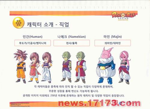 1.人类(Human):武道家/气功师/工程师 2.那美克(Namekian):战士/龙族 3.魔人(Majin):义魔人/大魔人