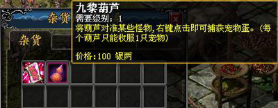 2.打开交易界面,购买一个【九黎葫芦】,每只九黎葫芦可以抓捕一只宠物。
