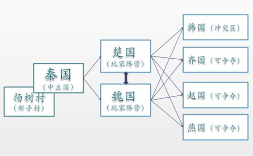 秦国为新手国家,所有新手出生时都属于该国家。楚和魏属于敌对国家,玩家等级达到41级时可以选择两个国家中的任意一个加入,楚与秦属于永久中立关系,魏与秦属于永久中立关系。