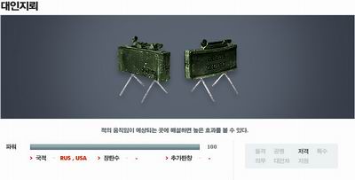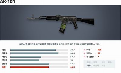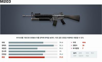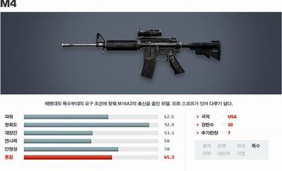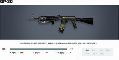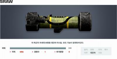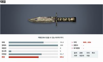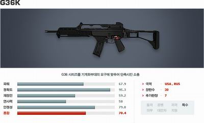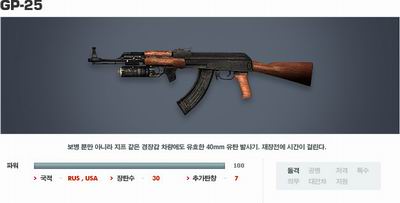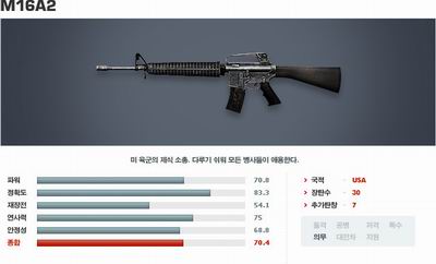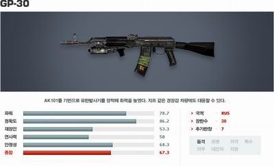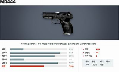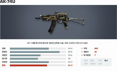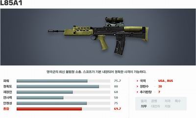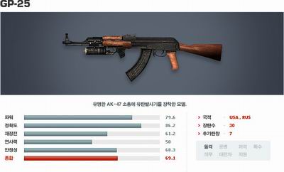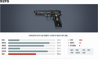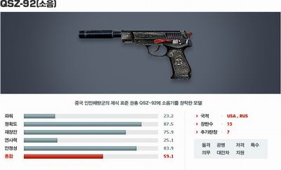 左(从上到下):威力、准确度、装弹、连射能力、稳定性、综合右(从上到下):国籍、装弹数、备用弹仓、武器类型