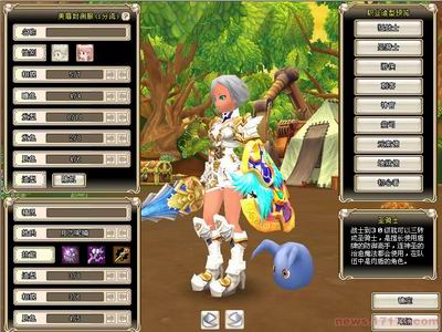 精灵之歌 打着精灵旗号而来的游戏,其重头戏就是那个小不点。玩家初始时可以选择一位心仪的小精灵陪伴,虽然造型、相貌、肤色可更改,总脱不了那个没手没脚只会蹦的原始“球”形模样。精灵们有其自身的姓氏,其实就是精灵的能力区别。作为游戏人物的辅助角色,它所拥有的能力不外是为玩家而服务的。例如制造能力里,就分为斧类、锤类、弓箭类、剑类、盾牌等等不同的武器制造,这自然是依玩家的职业而分,为玩家打造称手的武器。笔者在选择初始精灵时,没有过多的注意其姓氏分类,结果硬是把一名魔法攻击的人物配上一名只会做斧子的精灵,让英雄无用武之地,真是遗憾。