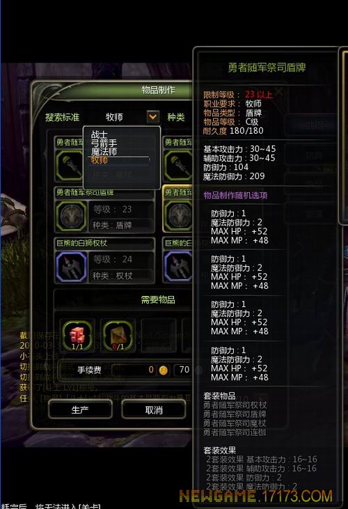 每个职业相对应的制作材料也不一样。材料种类分为宝石与阳光石,强化装备需要绿色碎片。宝石与阳光石用来制作装备,并且也有相应的等级现在是见到有C级与B级的。红色宝石为战士制作材料,蓝色宝石为弓箭手制作材料,黑曜石为魔法师制作材料,黄水晶为牧师的制作材料。钻石是用来强化+6装备升至+7以上使用。材料可以通过副本的怪物掉落,开宝箱的获取以及分解装备获得。