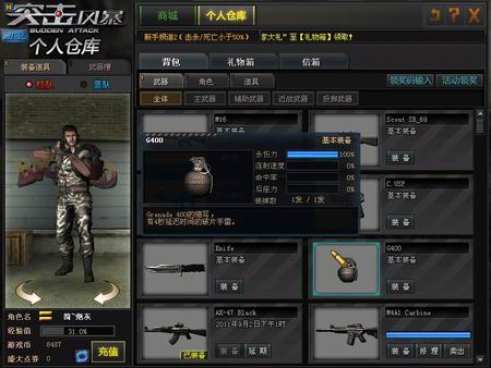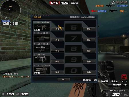 游戏中刚开始时,背包中拥有,M16、USP、RS_69、手雷和小刀以及50000的游戏币。游戏币在商城中可以买到所有枪械,在游戏中每回合会得到游戏币100-300不等,AK、M4需要12000游戏币,AWP需要24000,沙鹰需要9000,AK、M4、沙鹰、AWP性价比都很高。一开始的游戏币足以配齐基本的枪械,游戏常见的枪械还是AK、M4、AWP、沙鹰老4样。