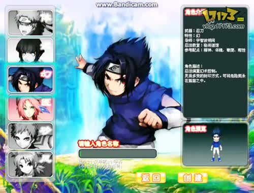 这款以日本动漫《火影忍者》改编的网游,在创建人物时,我们就可以看见《火影忍者》里的漩涡鸣人、日向雏田、宇智波佐助、春野樱、我爱罗和手鞠。这几个人物就是游戏人物的主要造型啦。鸣人的特性是体、雏田为武、佐助是幻、小樱是医、我爱罗自然是砂、而手鞠则是风。