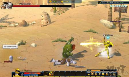 选择好战士后就能正式进入游戏了,一开始系统会先以动态漫画的方式述说整个游戏的前景故事,看完后会有指导NPC来对玩家介绍基本的游戏操作方式,如一开始按下空白键让主角变身,变身后就能使用技能了,方向键可控制角色移动方向,双击方向则是跑步,而因为《恐龙战士OL》采用八方位移动的设计,所以同时按下相邻的两个方向键能往斜角移动与攻击,另外C键为跳跃、X键为攻击,Q到 F键为快捷键,可放置技能或药水在其中以便于使用。