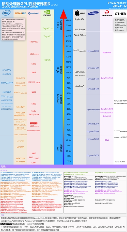 其实对电脑硬件有一点了解的人应该都知道,玩游戏主要得看显卡(部分游戏吃CPU我就不多说了),也就是GPU,手机玩游戏同样如此,特别是3D游戏(包括光明),流不流畅基本取决于手机的GPU,但是和PC端不一样是的是移动端CPU和GPU被共同整合在一颗芯片上,也就是说什么样的CPU就对应什么样的GPU,知道了CPU的型号也就知道了GPU的型号,那么目前主流手机所用CPU所对应的GPU性能又是怎样的呢?下面用一张天梯图让大家快速了解各类CPU对应GPU的性能情况。