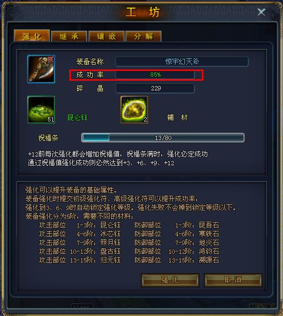 2.强化有成功率,当强化失败时,强化等级会掉阶段,如+9失败会直接掉到+6。当装备达到+3、+6、+9、+12时,会自动铭刻,锁定强化等级,铭刻后强化失败也不会掉到锁定的强化等级以下。