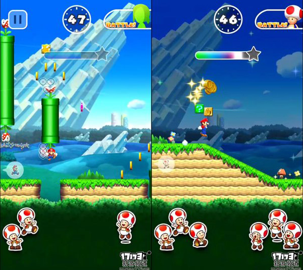 手游《超级马里奥跑酷》延续了《超级马里奥》兄弟近几代作品之中的画面,虽然游戏仍旧是采用2D横屏的跑酷玩法,但是人物的动作设计中的转头、摆手、翻滚等动作细节均将游戏画面从2D平面强行拉伸成为3D式的画面。而游戏在场景及物件上的设计同样也是延续了《超级马里奥》中的所有物件,基本来说本作在画面上是彻底将《马里奥兄弟》从掌机、主机平台搬运到了移动平台上。游戏下载 >>>>