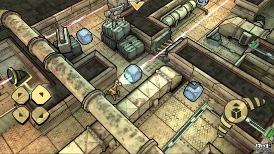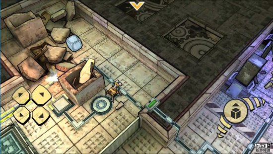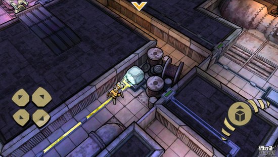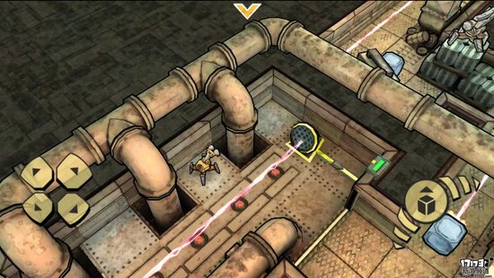 在《克拉克》游戏中,玩家使用虚拟按键来控制主角,方向键控制移动方向,滑块键控制场景的转向的设计虽然很简单,但是游戏斜上方45度角的移动设计还是让游戏的操作感稍显不同。另外游戏在右侧的划屏转向设计上也设计的相当平滑,只需要适当的滑动就可以进行转向、抬起等操作。