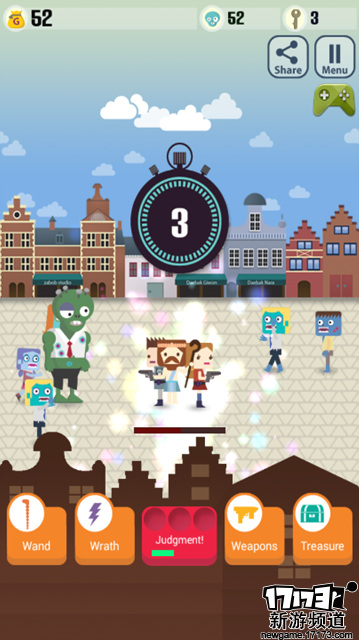 手游《僵尸审判日(Zombie Judgment Day!)》在操作玩法上并没有太过复杂的操作,玩家只需要点击僵尸,就能够进行攻击消灭僵尸。与此同时,你还需要注意点击罩子中的人类,通过点击让罩子回复能量以保护人类,免受僵尸的侵害。如果仅是这样无脑的点击,那这款游戏也就毫无乐趣可言。在玩家消灭僵尸以及守护人类的同时,下方的能量条也在逐步积累,当能量集满之时,将会出现“上下左右”以及一个“法杖”按键,通过一定的顺序按键组合即可合成各种不同的技能来解决大范围的敌人,闪电、洪水、火球、龙卷风等等的技能特效,总算是让你看起来像个上帝了。