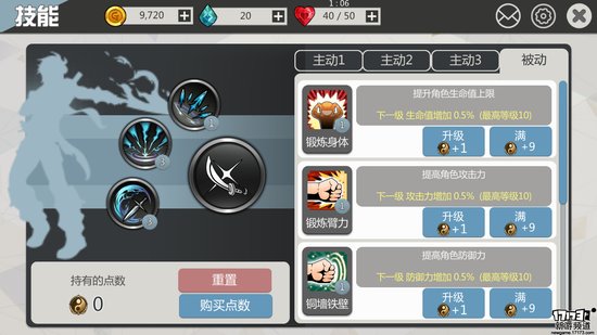 同样的游戏之中还是有着技能强化的设定,角色的三个主动技能目前看来是固定不动的,而被动技能则是简单粗暴的提升各项属性。技能的获取为每一级获得一点,不过玩家能够直接花费钻石直接购买30点用于升级主动技能,虽然存在消费内容,不过基本能够使用游戏赠送的钻石用于填补,总的来说还算得上良心。