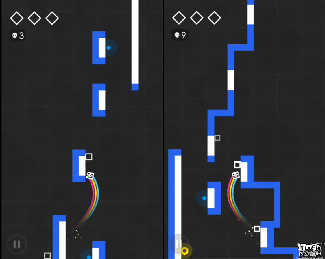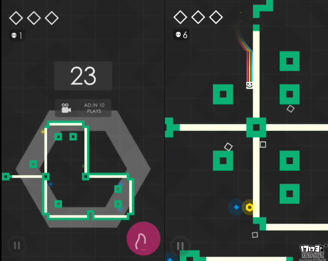 虽然游戏在操作上仅仅只是简单的点击屏幕来控制游戏中的小方块来进行跳跃,但是需要注意的是我们的小方块只能够在白色区域移动,若是撞到其他色彩区域则直接game over。在我们控制小方块进行跳跃时,当其跳向虚空区域时会受到引导而进行环形运动,预判小方块的运行轨迹也就显得尤为重要。