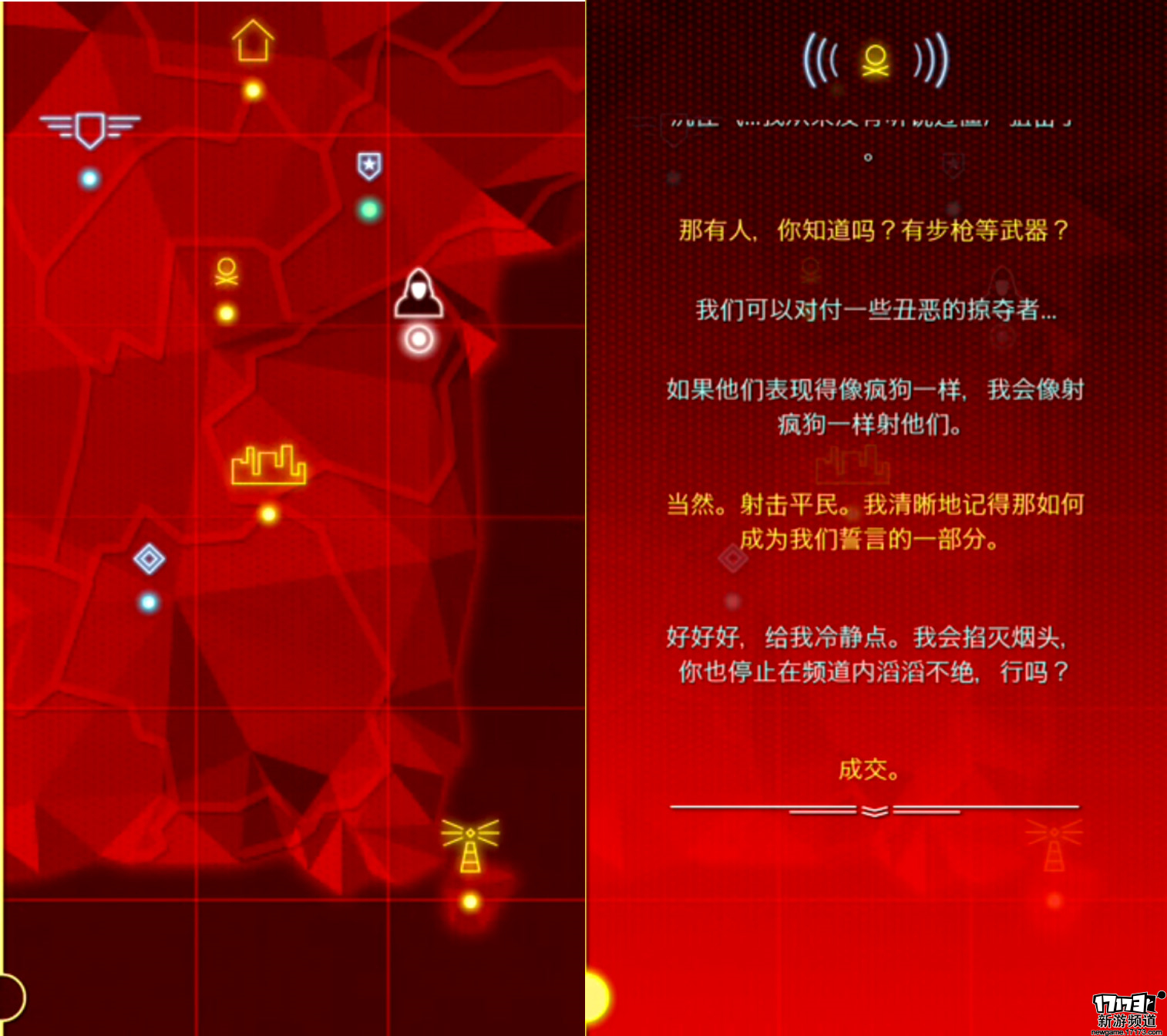 游戏虽然还是如同短讯般的对话展开,但是在对话的基础上还加入了地图设定,玩家能够根据直观的看到我们的主角目前当前所处的位置,以及游戏中数个重要场景以信号发送点作为标示,也能够让我们更加直观的判断我们的主角当前所处的情况。
