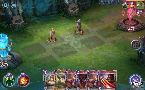 手游《英雄战歌》在玩法上采用了较为轻度的策略卡牌玩法,同样是两名玩家的实时策略比拼,但是游戏中的战场设计略有不同游戏采用了前二后三的战斗布局方式,前排的两个随从位能够阻挡敌人进攻你的水晶,而后排三个位置则能够受到前排的保护并且更好的进行站场。