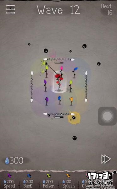 《花战》是一款非常简单的塔防游戏,游戏的灵感也许是来自最近电影正在火热造势的《美女与野兽》,你要像野兽守护生命之花一样,守护在游戏正当中带着玻璃罩子,看起来就是一朵妖艳贱货的红玫瑰。点击下方的三角播放键,就会有一波又一波的虫子向玫瑰花袭来,点击屏幕下方不同颜色的花,建立起防御强,这是一场没有尽头的车轮战,每十关就会又一波boss(就是大虫子)袭来。