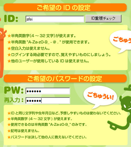 注册步骤三:在新页面中,依次输入登录ID、密码,以及游戏中昵称,以及个人相关信息,最后点击最下方按钮确认。如下图顺序所示。(注:个人信息中的姓名等内容可copy此页面中的日文字符,此页面确认后,还会弹出一个页面,需再次确认)